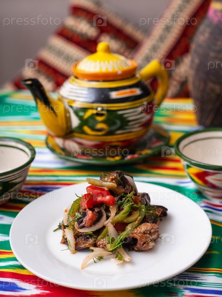 Теплый салат из зеленого и красного перца, мяса, баклажанов, лука и помидоров в азиатском стиле