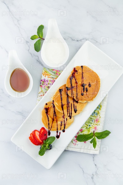 Блины с шоколадным сиропом с клубникой и мятой, вид сверху