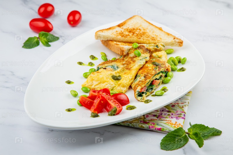 Завтрак из яиц и овощей с помидорами черри и ломтиками хлеба на белой тарелке, вид сбоку