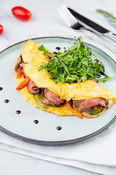 Завтрак из яиц с мясом, зеленью и каплями соуса на круглой тарелке, вид сбоку