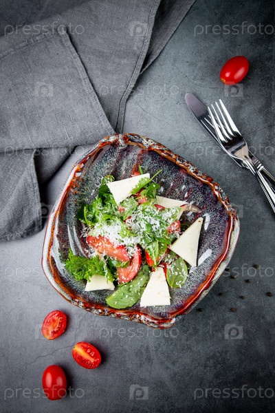 Салат с помидорами, сыром фета, листьями салата и петрушкой в необычной миске, вид сбоку