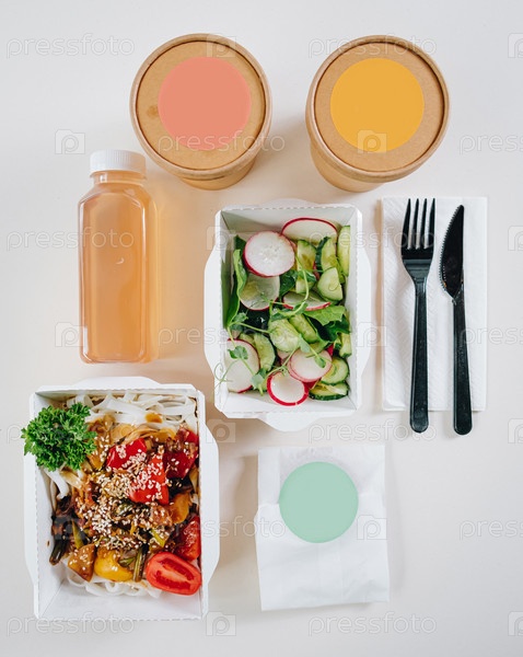 Еда в контейнерах. правильное питание, ежедневный рацион, похудение. суп, напиток, салат, стейк. Вид сверху