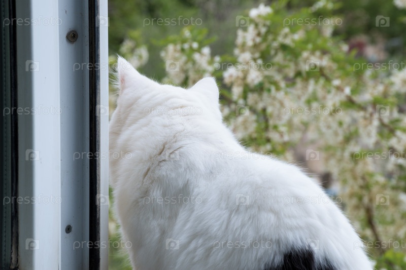 Бело-черный кот сидит возле открытого окна на подоконнике