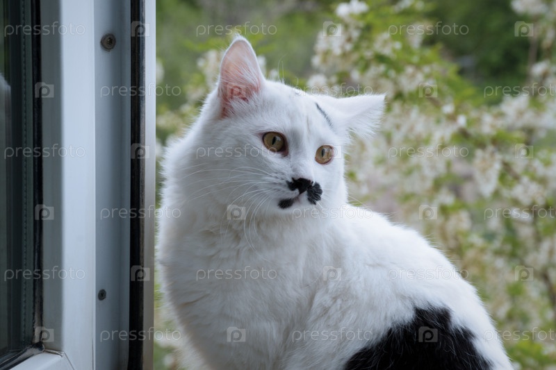 Бело-черный кот сидит на подоконнике
