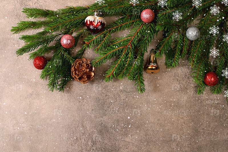 Рождество и Новый год 2024 фон с еловыми ветками в снежинках на бетонном столе, игрушками и украшениями, баннером для праздничного экрана, шаблоном для дизайна. Праздничная открытка, избирательный фокус,