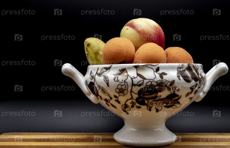 Тарелка с фруктами на деревянной подставке. Черный фон