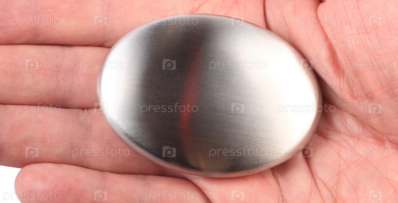 Рука с мылом из нержавеющей стали изолирована на белом фоне