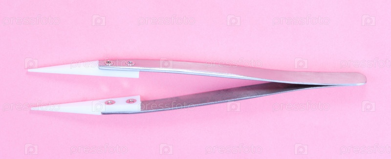 Стальной керамический пинцет на розовом фоне