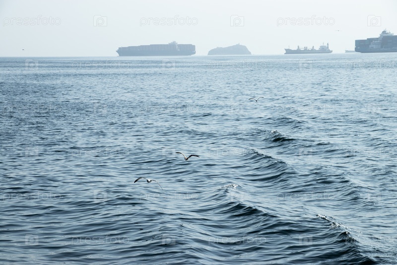Чайки на фоне кораблей в порту Владивостока