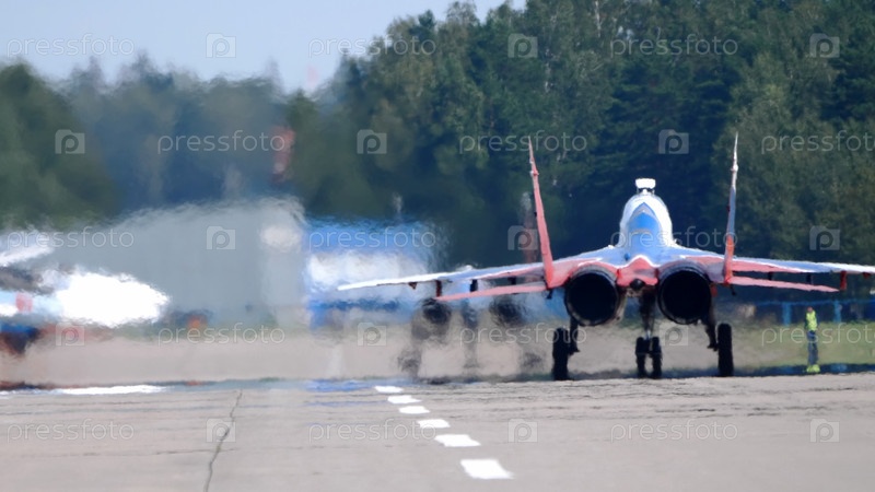 Москва Россия Аэродром Жуковский 31 августа 2019 г.: пилотажная группа Стрижи МиГ-29 готовится к взлету международного аэрокосмического салона МАКС-2019. Москва Россия Аэродром Жуковский 31 августа 2019 г.: пилотажная группа Стрижи МиГ-29 готовится к взле