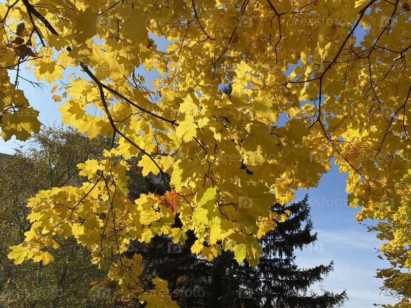 Желтые кленовые листья на дереве в сухой солнечный осенний день