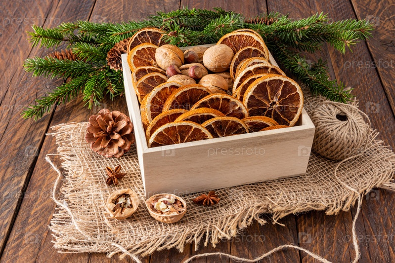 Квадратная деревянная коробка с сушеными ломтиками апельсина и грецкими орехами на мешковине и деревенском столе с зелеными еловыми ветками. Эко-рождественский стиль