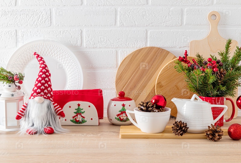 Шикарный кухонный фон, украшенный новогодними предметами, игрушками, посудой. Стена из белого кирпича. Деревянная столешница. Экологичная кухня