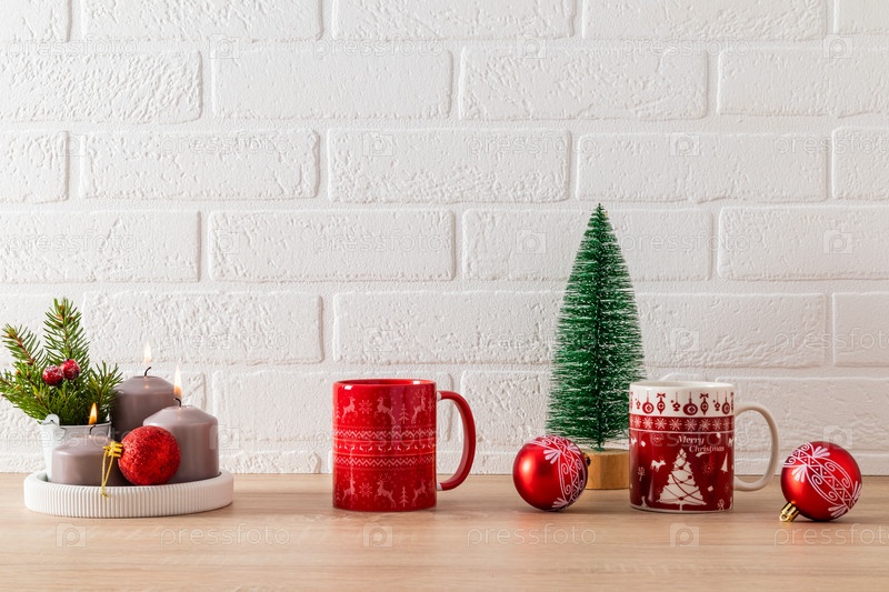Красные кружки с рождественским узором, набор свечей, красный шар и декоративная елка на кухонной столешнице. Праздничный кухонный фон. минимализм