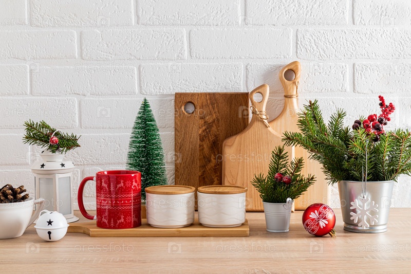 Стильный новогодний декор на новогодней кухне. Красивая кухонная утварь, украшенная зелеными еловыми ветками, шарами, новогодним фонариком