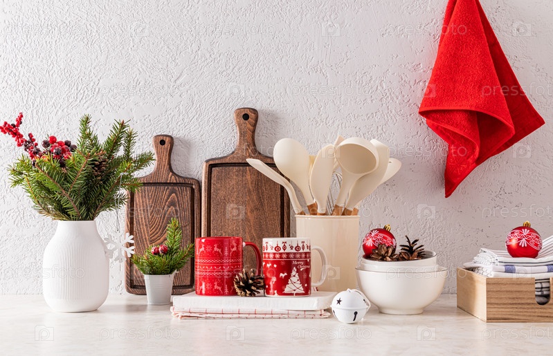 Кухонная утварь на украшенной к празднику новогодней столешнице с ярким новогодним декором в традиционных красно-белых тонах. вид спереди