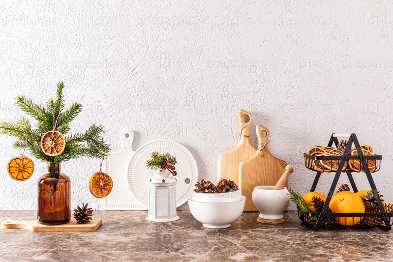 Стильный новогодний декор на новогодней кухне. Фрагмент столешницы с современным декором и кухонной утварью. Эко стиль
