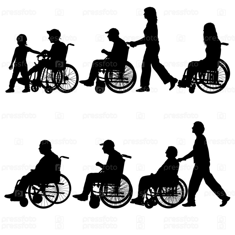 Силуэты инвалидов в инвалидной коляске на белом фоне