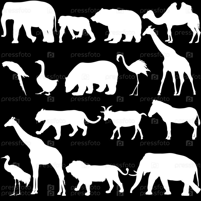 Силуэт слона, медведя, орла, рыси, утки, зебры на белом фоне