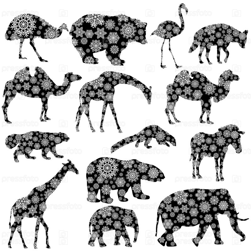 Рождественская открытка слон, жираф, медведь, фламинго, зебра, верблюд, гиена в снежинках на белом фоне