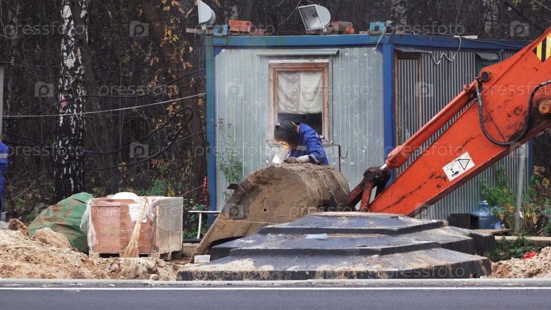 Рабочие-сварщики изготавливают электросварку ковша экскаватора