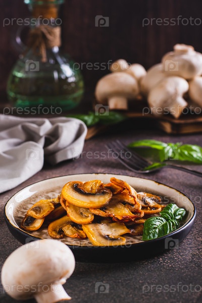 Аппетитные жареные шампиньоны и листья базилика на тарелке на столе, вертикальный вид