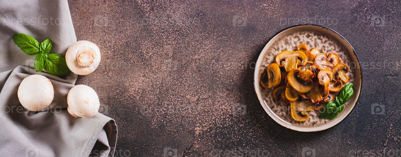Пикантная закуска из жареных грибов шампиньонов с базиликом на тарелке, вид сверху, веб-баннер