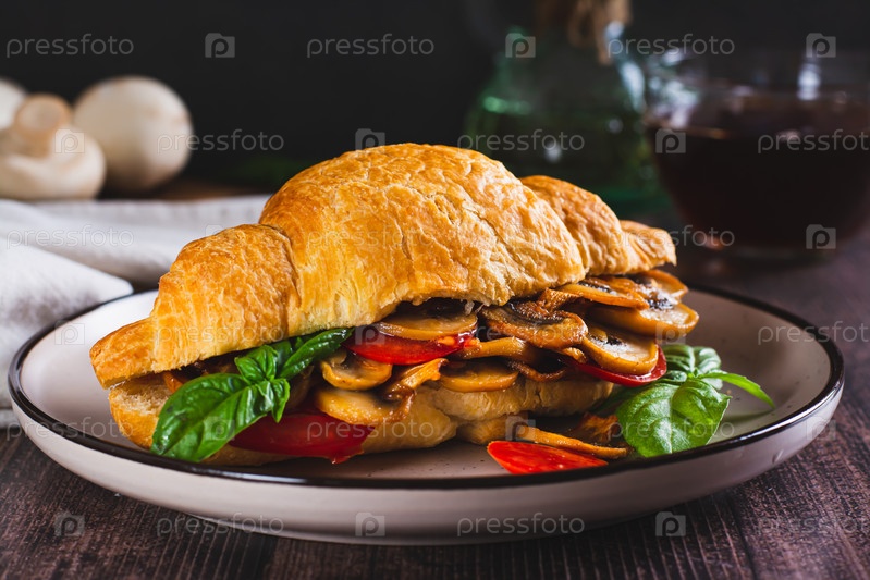 Аппетитный круассан с начинкой из жареных шампиньонов и помидоров на тарелке