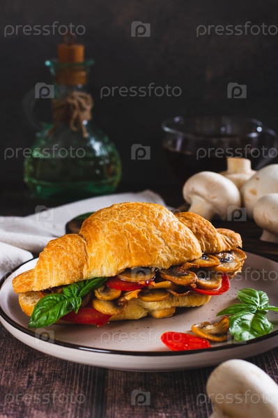 Аппетитный круассан с начинкой из жареных шампиньонов и помидоров на тарелке вертикального вида
