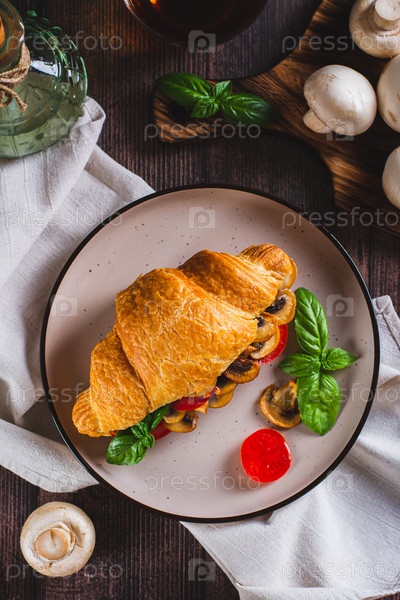 Свежий круассан с жареными грибами, помидорами и базиликом на тарелке и вертикальный вид