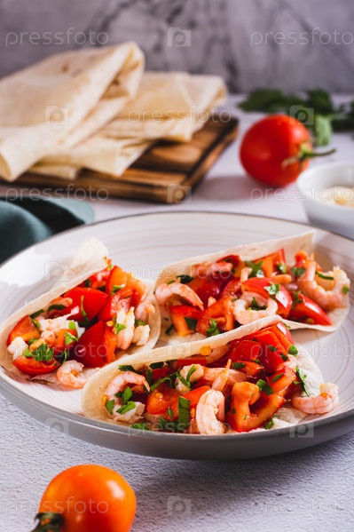 Вегетарианские мини-тако с помидорами, креветками и зеленью на тарелке на столе, вертикальный вид