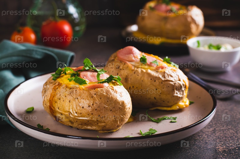 Запеченный целый картофель с яйцом, сосисками и зеленью на тарелке