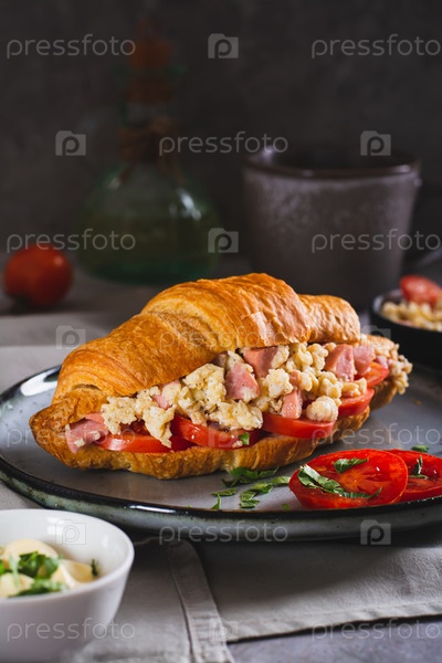 Сэндвич с круассаном и яичницей, сосисками, помидорами и зеленью на вертикальной тарелке