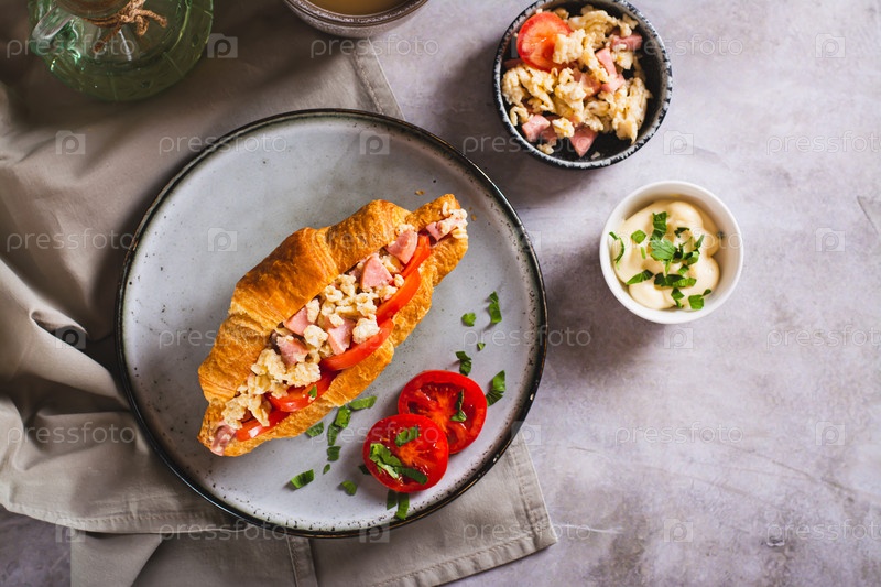 Сэндвич с круассаном и яичницей, сосисками, помидорами и зеленью на тарелке сверху