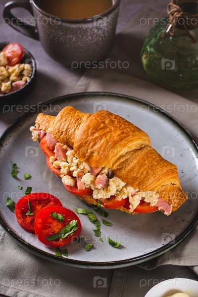Вкусный сэндвич с круассанами, яичницей, сосисками и помидорами на вертикальной тарелке