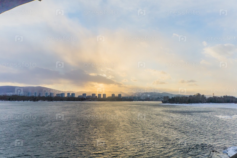 Морозное туманное зимнее утро над рекой Енисей в центре Красноярска