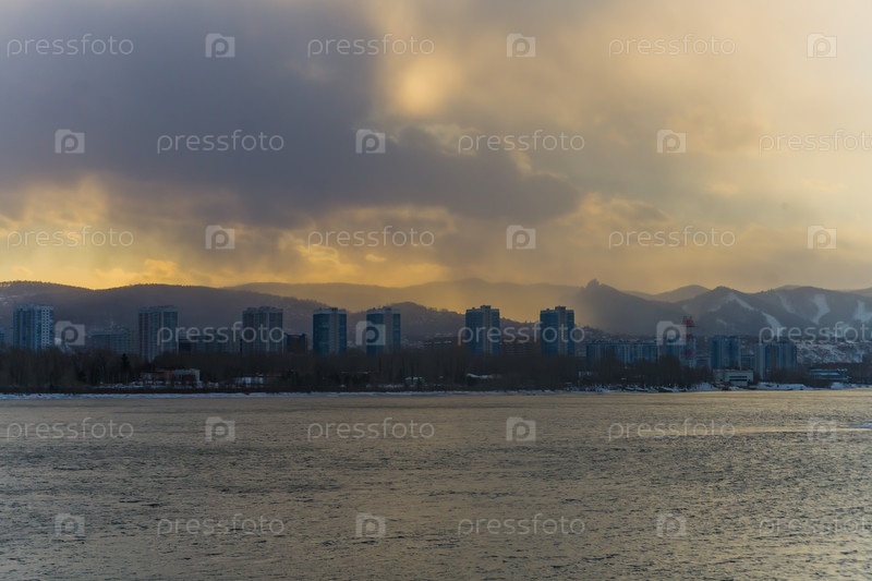 Морозное туманное зимнее утро над рекой Енисей в центре Красноярска