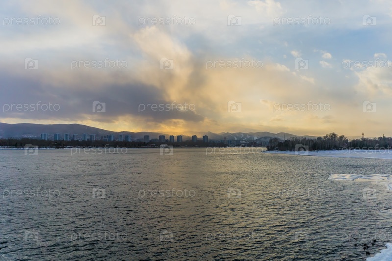 Морозное туманное зимнее утро над рекой Енисей в центре Красноярска