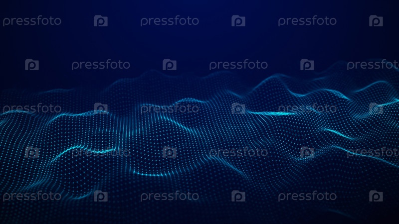 Футуристическая светящаяся волна. Понятие больших данных. Подключение к сети. Кибернетика. Абстрактный фон синих точек, образующих волну. 3D-рендеринг