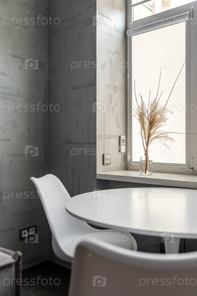 Круглый белый стол стоит возле окна, на подоконнике сухие растения в вазе