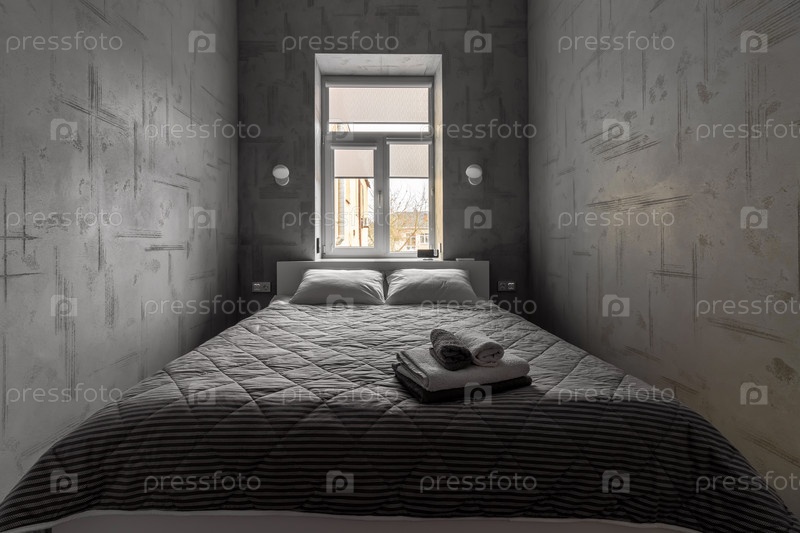 Кровать в спальне, на фоне окна и светящихся бра на стене