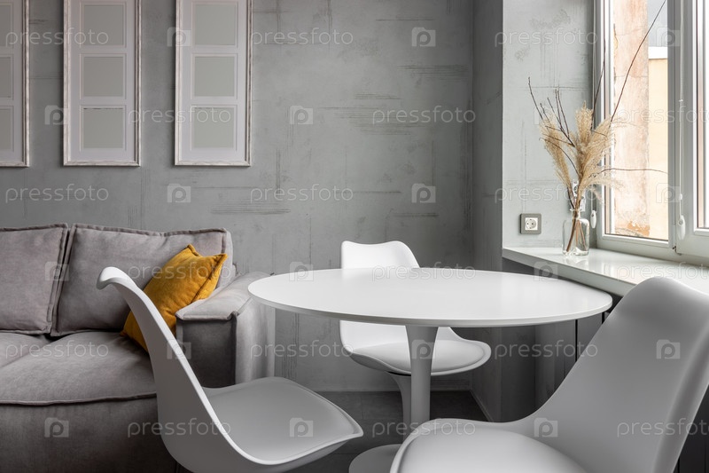 Квартира с белыми стульями и круглым деревянным белым столом