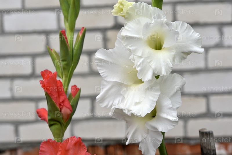 Белые цветы гладиолуса в летнем саду