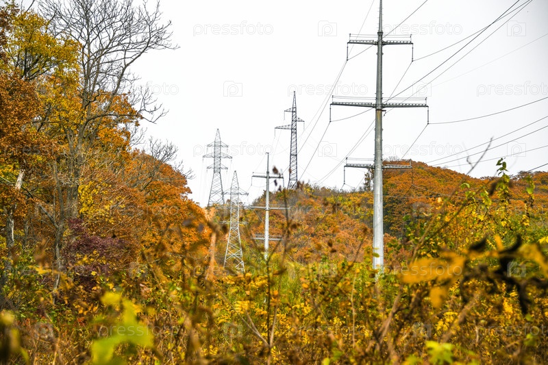 Высоковольтные провода на фоне осеннего леса