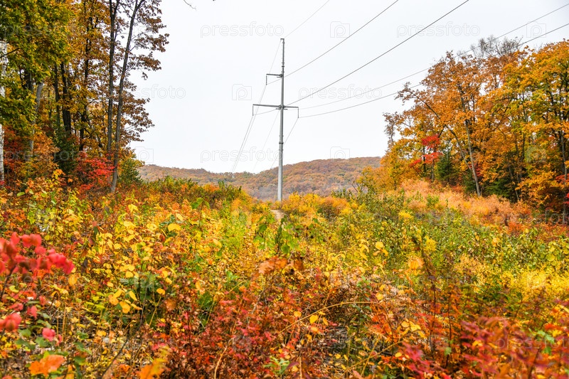 Высоковольтные провода на фоне осеннего леса