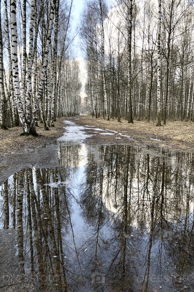 Стволы берез отражаются в луже талой воды ранней весной природный ландшафт