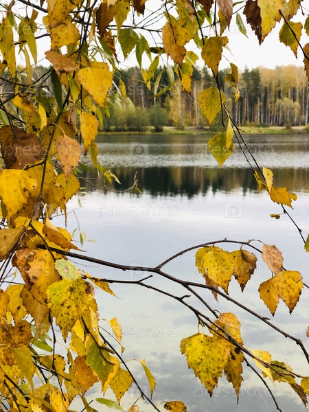 Лесное озеро в естественной рамке из желтых березовых листьев осенний пейзаж