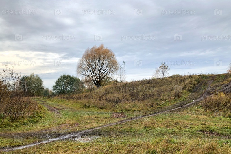 Осенний пейзаж с одиноким пожелтевшим лиственным деревом на холме, покрытом сухой травой