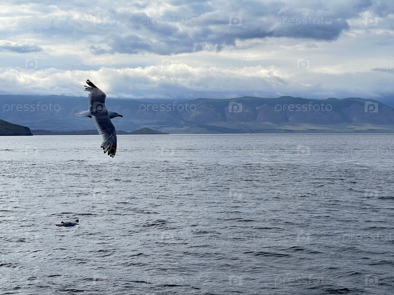 Чайка летит в небе над озером Байкал