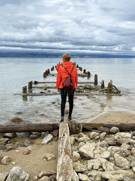 20 июля 2022 г. - Озеро Байкал, Россия: Девушка с рюкзаком стоит на берегу озера Байкал, возле старого разрушенного пирса
